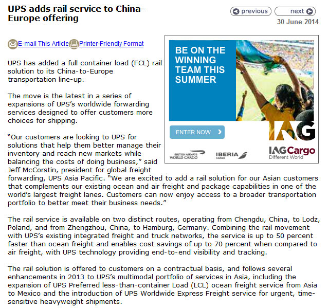 ![]() 提高歐洲與中國彈性地板物流高效及低成本的新渠道--ups新增中國至歐洲鐵路運輸服務 ups在中國至歐洲的運輸路線中新增了集裝箱鐵路運輸服務方案,這項方案也是ups國際運輸最新系列計劃中的一項,此方案將逐步為客戶 提供更多的線路選擇。 清查.拓展新市場,以保持業(yè)務發(fā)展與開銷的平衡。所以我們積極地為ups亞洲的客戶們建立起了一套鐵路交通方案以補充現(xiàn)有的航運和空運線路, 成為全世界最大的運輸通道之一!客戶現(xiàn)在可以享受到更寬泛的運輸服務。 網絡,速度比傳統(tǒng)海運提高了50%,成本比空運減少了70%。同時ups的貨物追蹤定位技術從頭到尾為客戶提供了安全和信譽的保障。 快遞服務以及時效性強和重量級的運輸服務。
