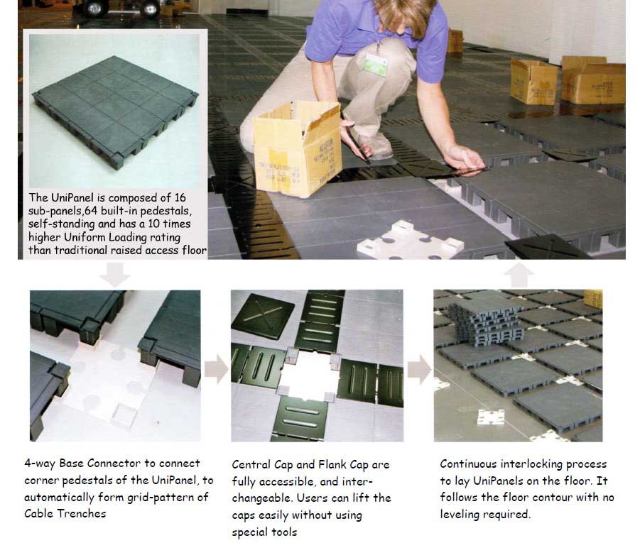 有別于一般傳統(tǒng)高架地板系統(tǒng)需將腳座以粘膠劑粘于地面固定,本系列產(chǎn)品之設(shè)計(jì)、施工不需使用粘膠劑。而是使用連接底座 連接腳架 |